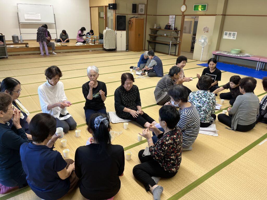 お菓子パーティーでは、「久しぶりにポテトチップスを食べた。」「鶯ボールが懐かしい。」と言いながら、お話に花が咲いていました。
