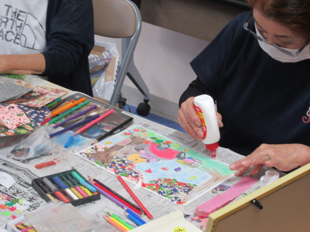 それぞれに色のつけ方に個性があり、くまのイラストにお化粧やまつげをつけて女の子にしている方やちぎり絵の部分を色々な色を混ぜてはっている人、単色でまとめている人など、それぞれオリジナルの作品を完成させていました🥰