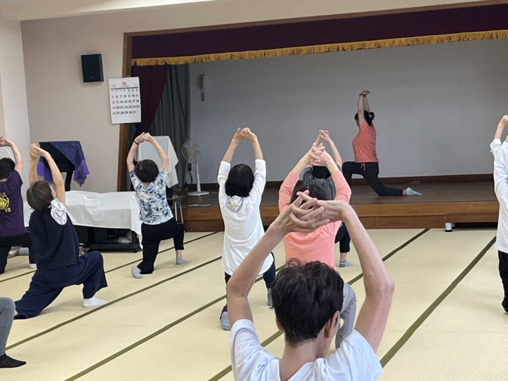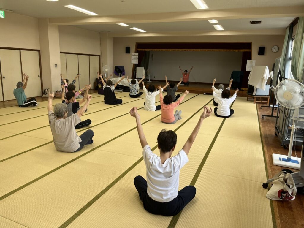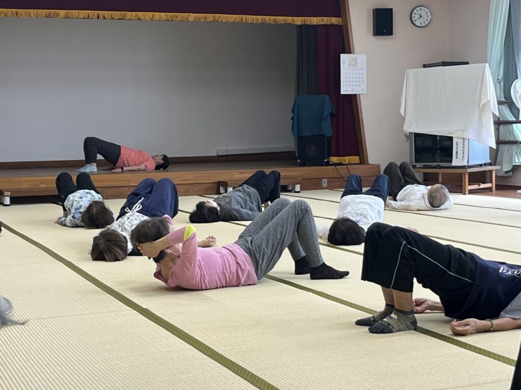 背中側で腕をくむ際には、「後5㎝程足りない!」とか、赤ちゃんのポーズで背中をほぐすために、ゴロゴロ左右に身体を揺らす動作を行なった時には、「戻らん、手伝って。」とか「全然動けん。」など、あちこちで笑いが起こり、結構きついポーズも難なくこなしました。朝の健康体操の継続の効果も実感し、日々の生活の中で意識して運動に取り組むことの大切さを職員も再認識させていただきました。