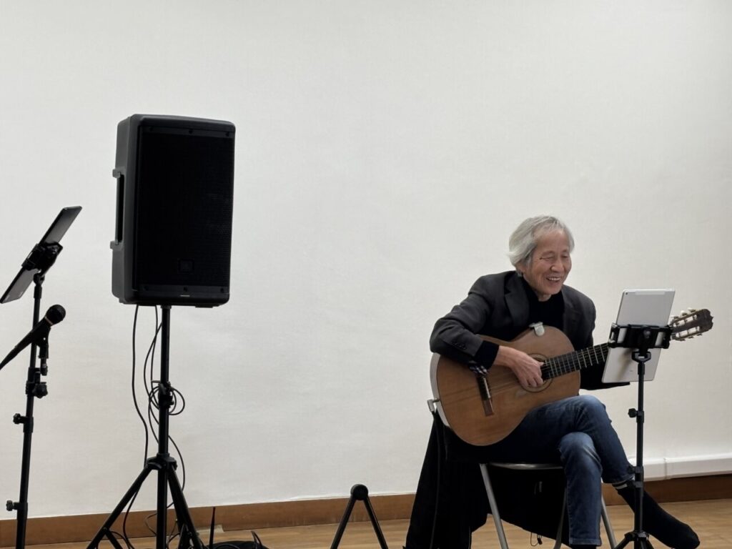 エレガットギター担当のYonさんこと守屋さんは、元ジャズのベーシストだそうで、定年後にギターを始め音楽ボランティア活動をされています。演奏できる曲目はものすごい数で、事前にいただいたリストだけでも700曲近くあり、贅沢ですが選曲が大変でした(;^ω^)