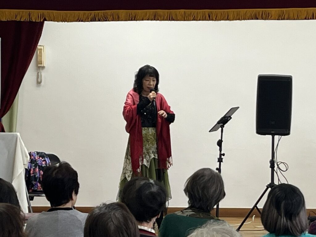 禁じられた恋、虹色、秋桜、やらずの雨、みだれ髪、愛の讃歌、そしてアンコールで枯葉、の7曲を美しい歌声で歌い上げて下さいました。みんさんうっとり聴き入っていました😍