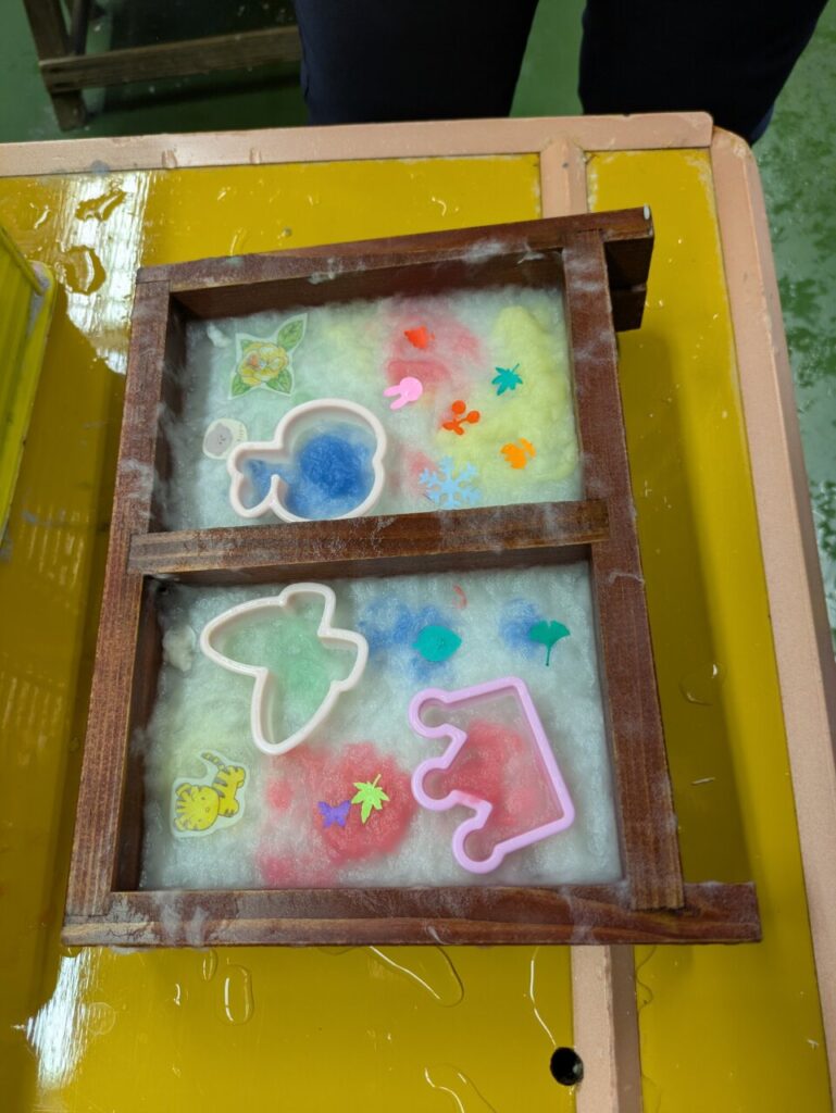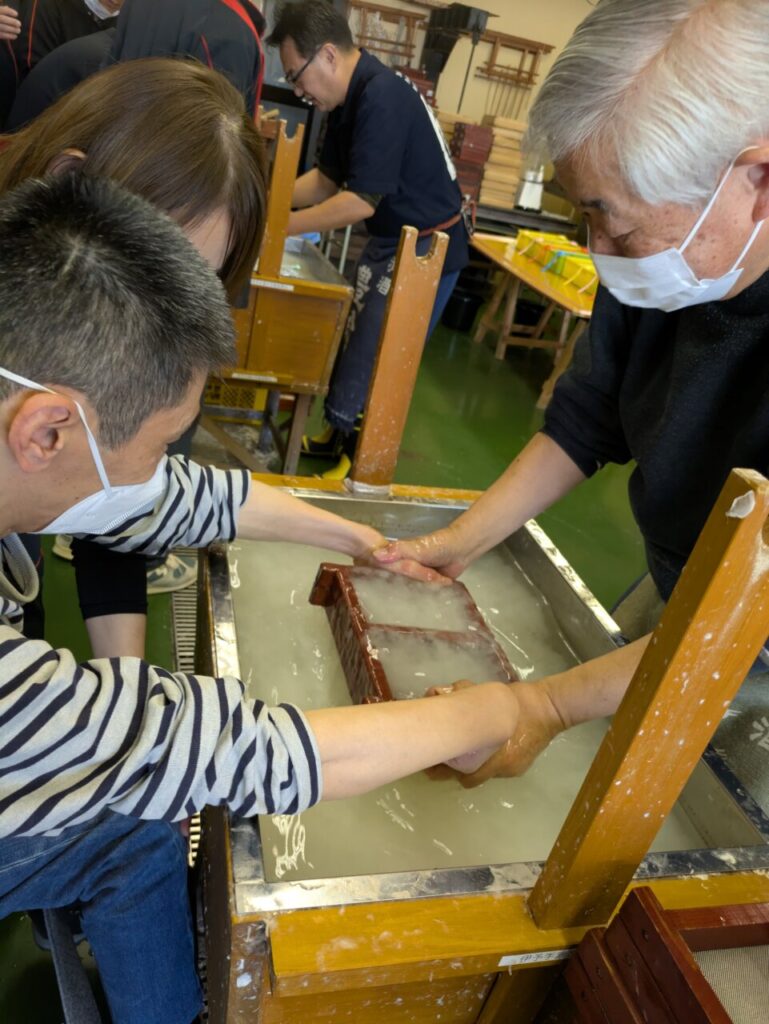 中野うどん学校さんの中で昼食をとり、お土産を選んだり買い物を楽しんだ後、次の目的地の「紙のまち資料館」での【紙漉き体験】に向かいました。こちらでも講師から、作業工程を丁寧に教えていただいたりサポートしていただき、個性あふれる素敵なはがきが仕上がりました。