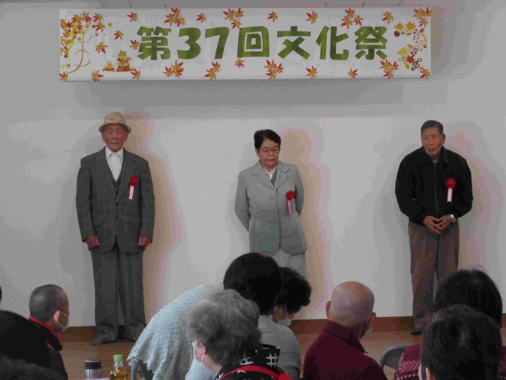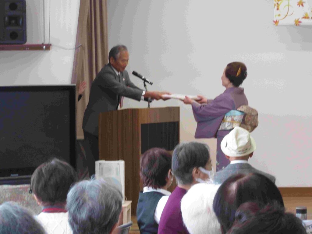 開会式では、90歳を超えて長年にわたり元気にセンターを利用され、他の模範となる長寿利用者4名の方と、15年以上サークル活動を行い、他の模範となる活動者1名の方の表彰を行いました。受賞者の皆さんおめでとうございます。