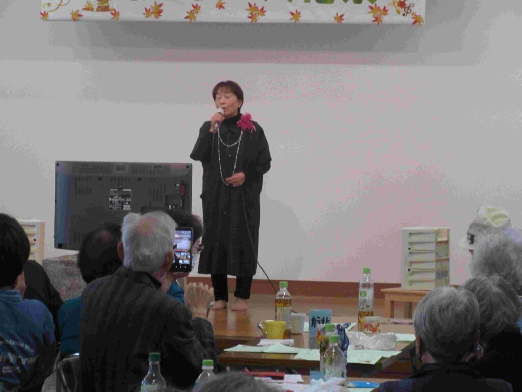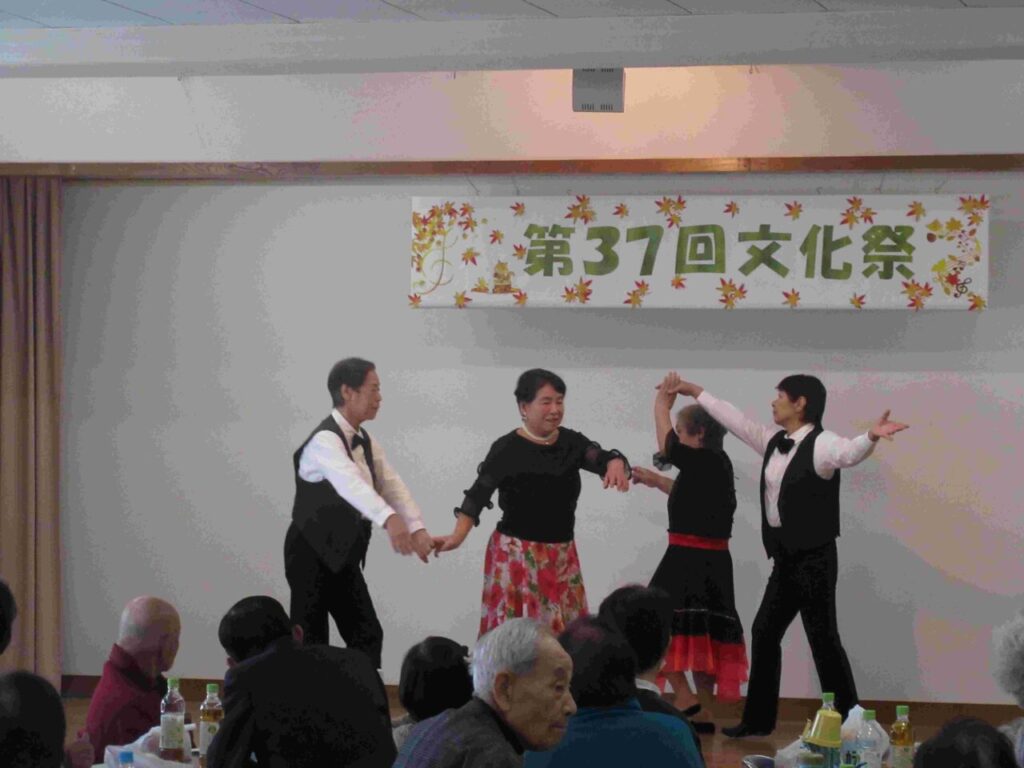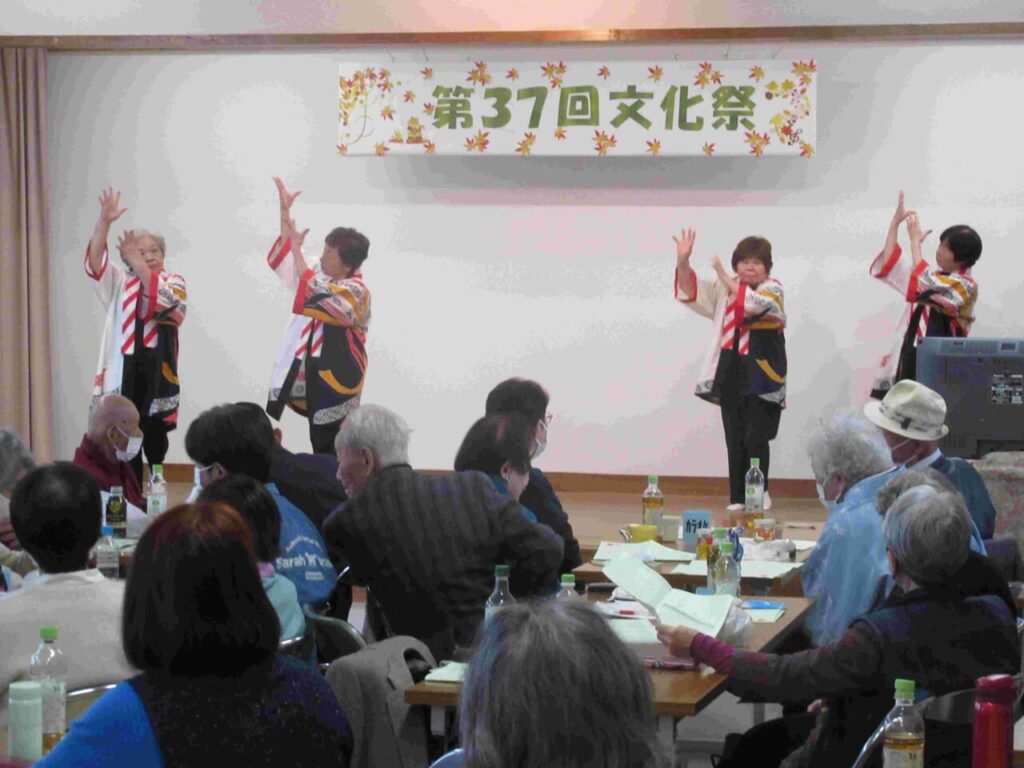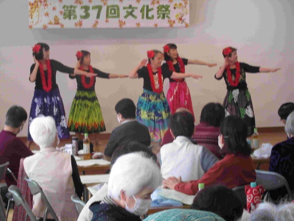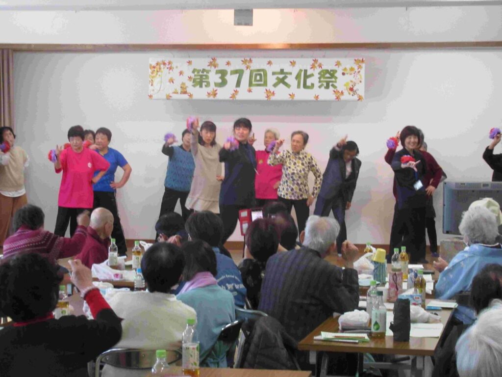 2階では、カラオケ 日舞 輪踊り フラダンス スクエアダンスサークルによる演芸大会を行いました。力強い歌声、色っぽい歌声、優雅な踊りと衣装、明るく楽しさいっぱいのステップに会場全体に笑顔があふれました。また、体操メンバーと職員によるリズム体操「狙いうち」では、みんなの手拍子で一段と盛り上がり会場が一体となりました。
