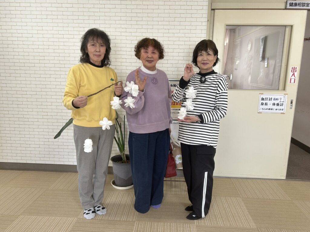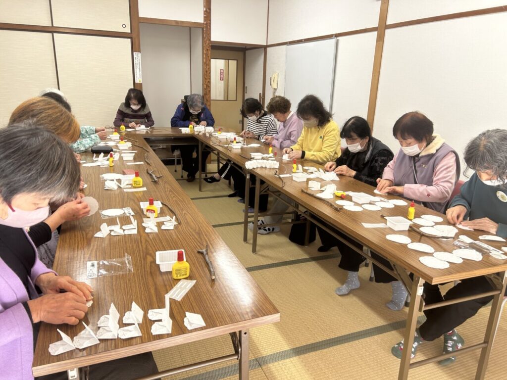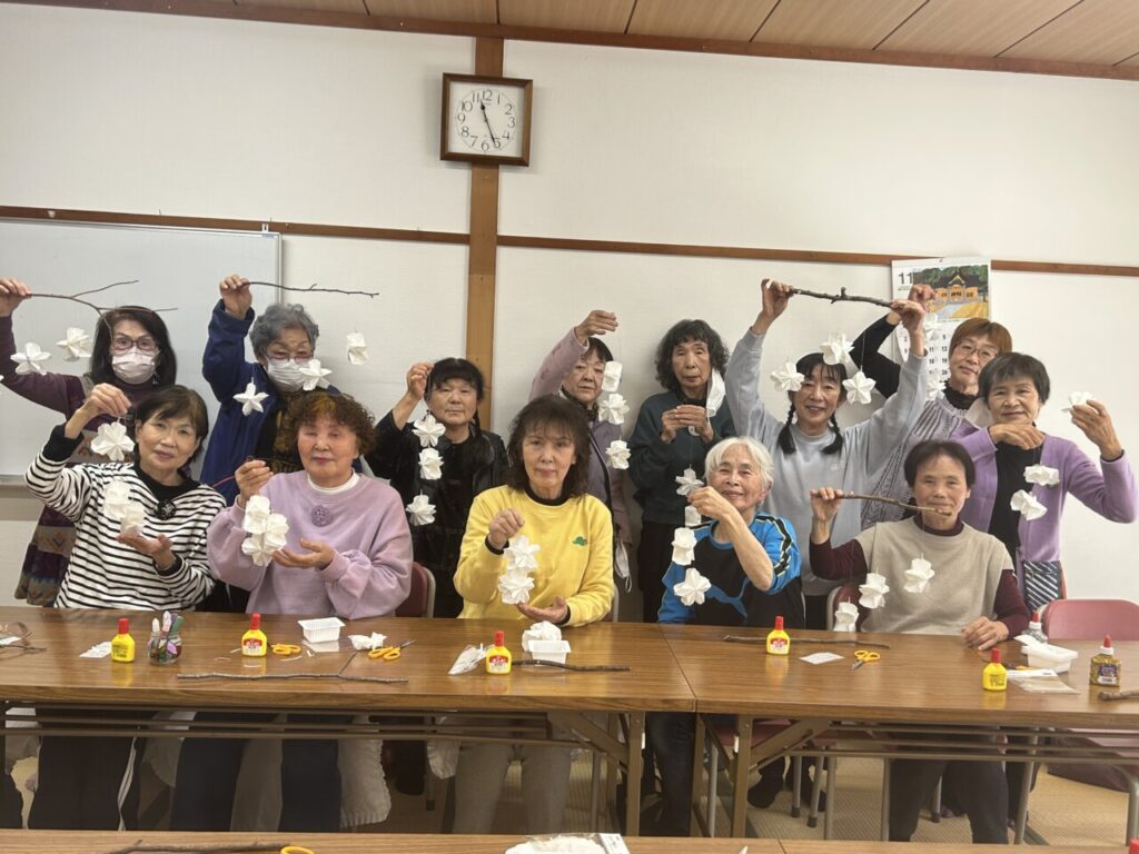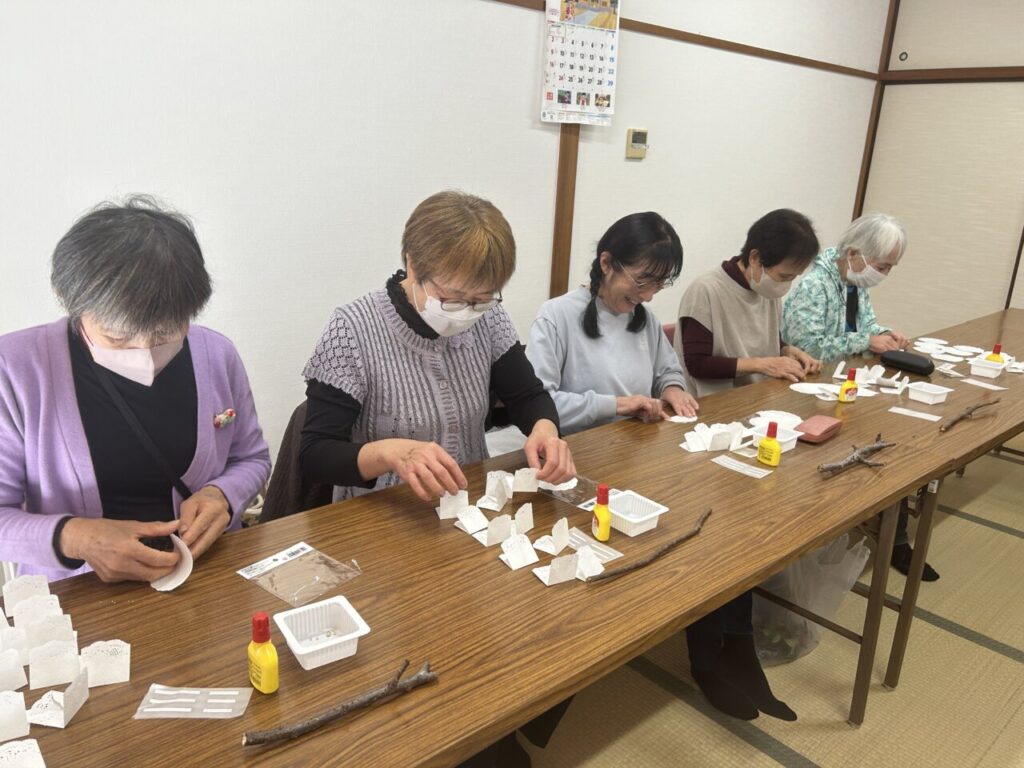 ごきげんよう(*^^*)シニア交流センター川西です。今回のニコニコにっこりは、可愛いらしいレースペーパーでクリスマスに飾れるようなオーナメントを作りました!「今日作るのを楽しみにして来たよ~」と言ってくれたりしたので、張り切って作り始めましたが、、、いざ始めてみると、「ボンドをつけすぎた~」「花びらが開かん~(>_<)」と悲鳴が、、、「ボンドをよくどしげ~にいっぱいつけないでね~」と伝えていたはずなのに、、、(T_T)