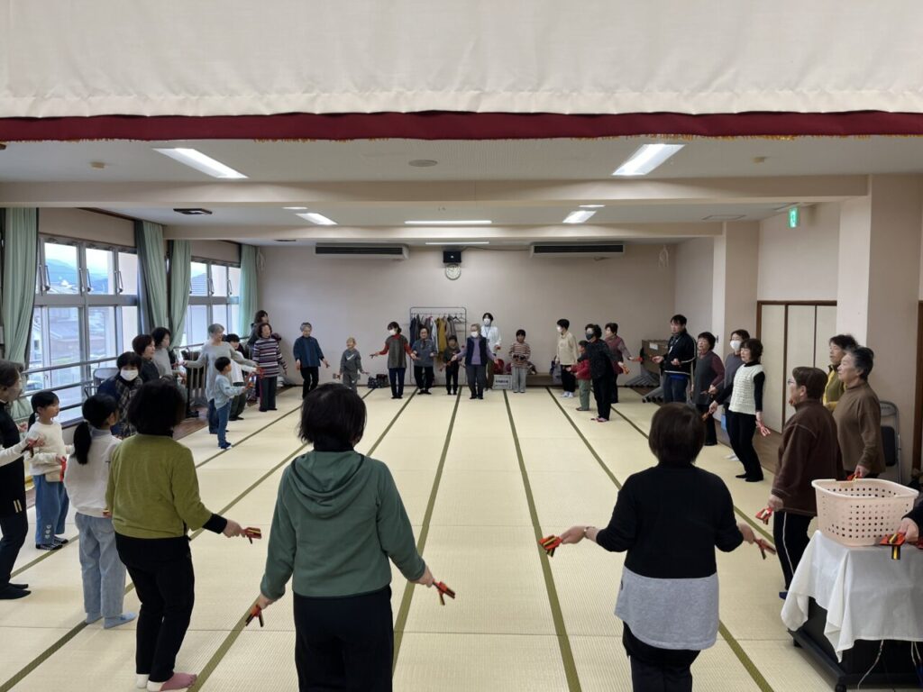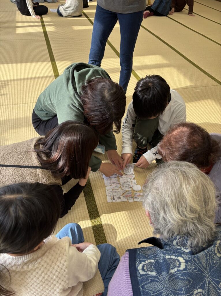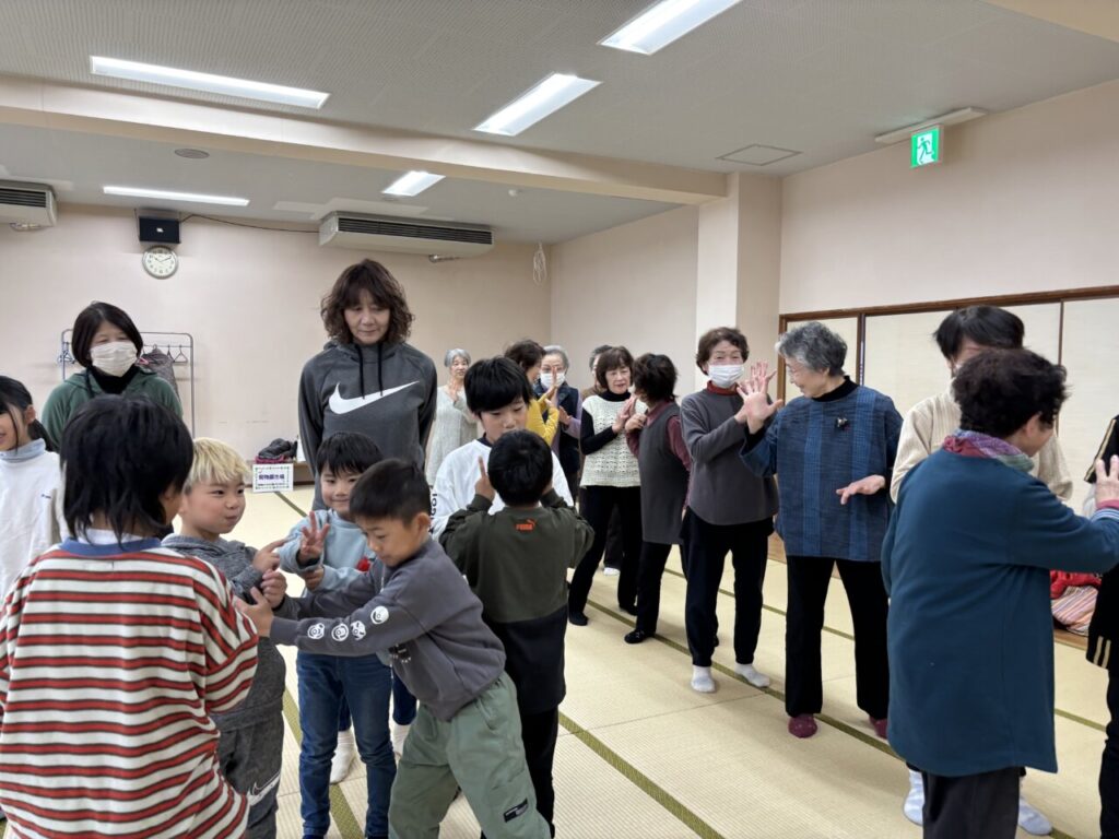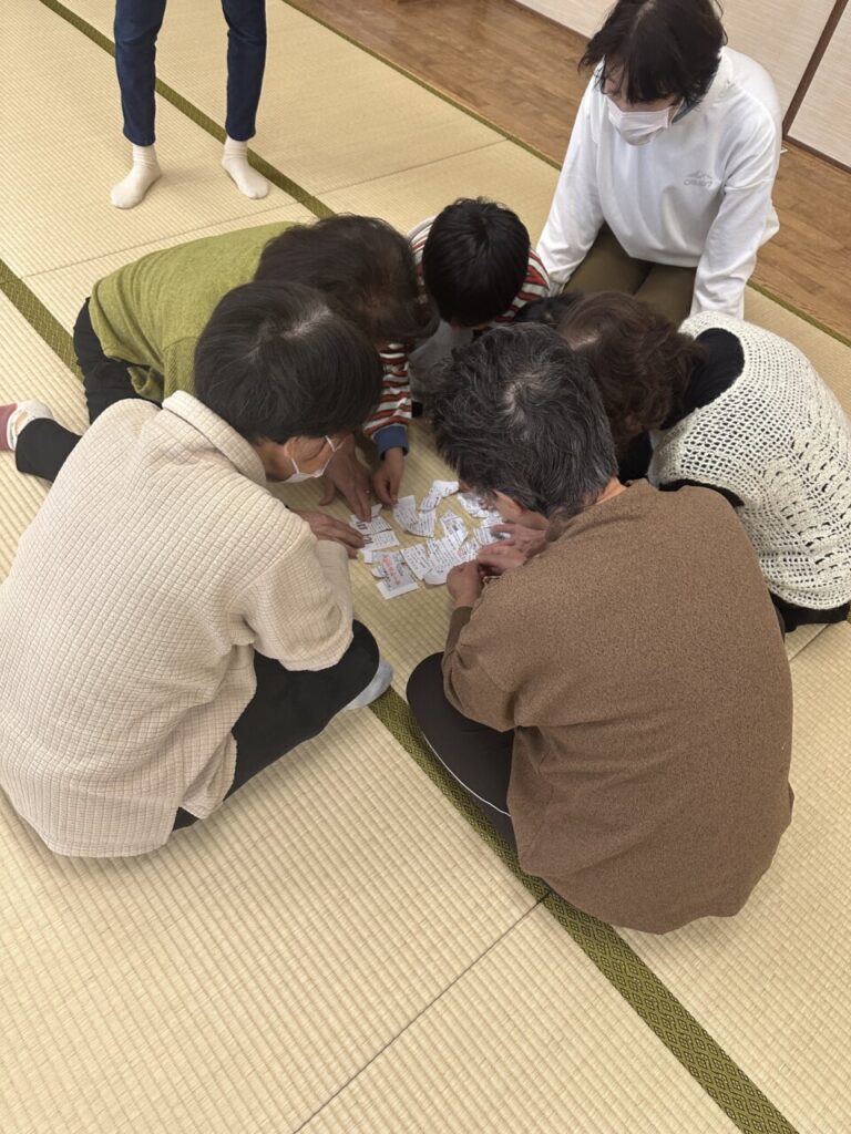 まずはみんなでいつもの鳴子体操🎵盆踊り大会やお花見会で必ずやっている体操なので、こどもたちもお手の物です👏そのあとは、喋らずにジェスチャーのみで誕生日を教え合い、誕生日の早い順に並ぶゲームをしました。おとなもこどもも完璧かと思いきや、意外にもどちらのチームも前後していて笑いが起こりました😆