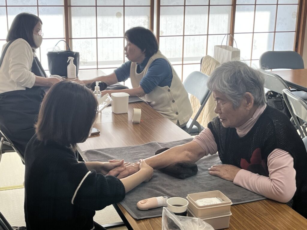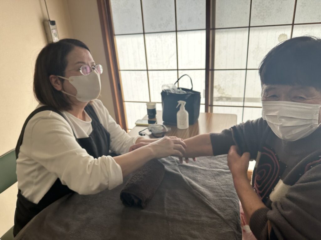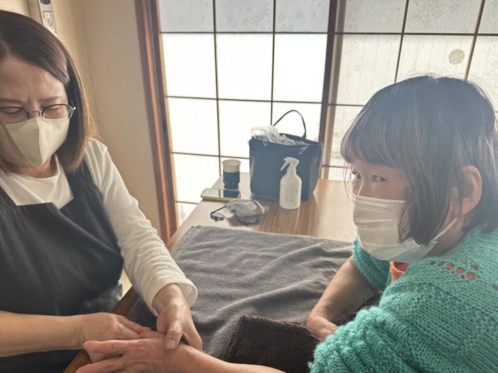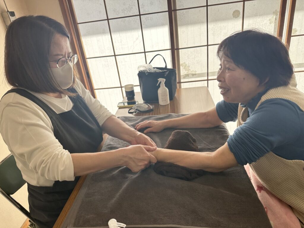 利用者さんにオイルを使ってハンドマッサージを施術していただきました。