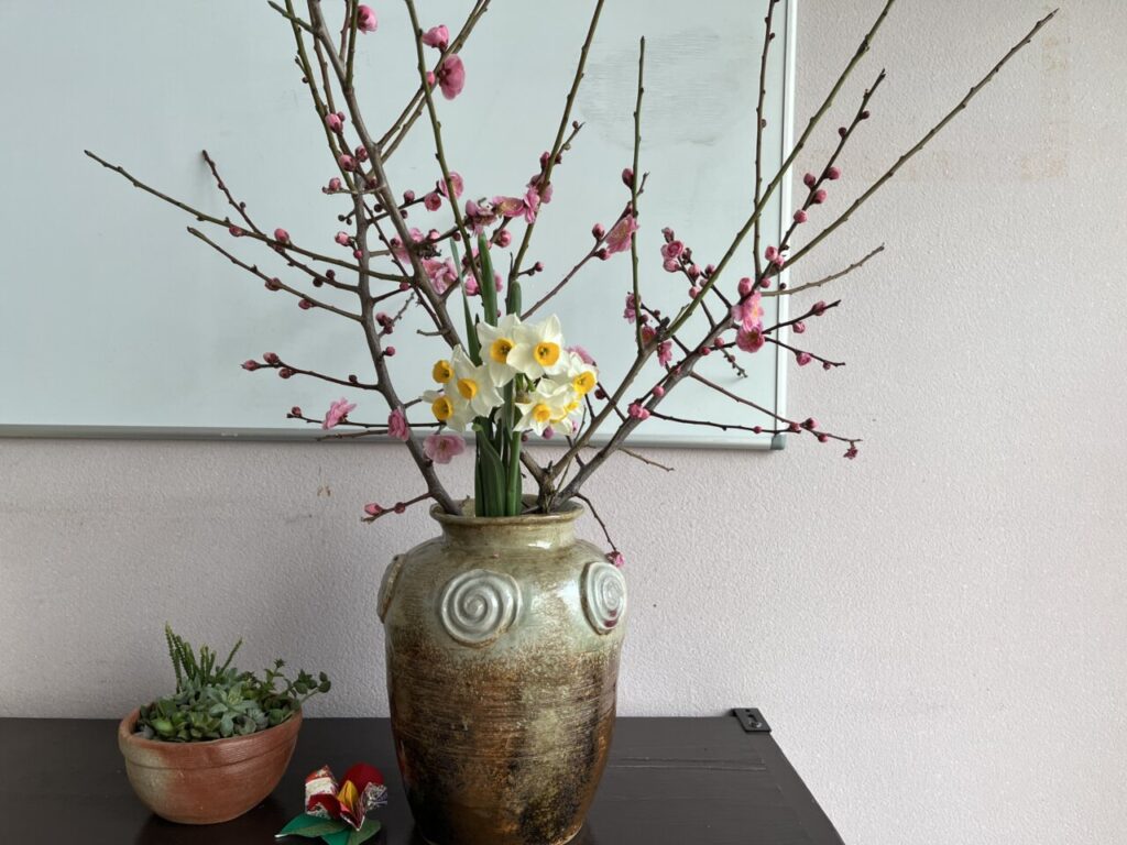 センターの玄関には可愛いピンクの梅の花が咲いています🌸先週まではしばらくロウバイを生けており、ロビーが優しい香りに包まれていましたが、今度は愛らしいピンクの色に癒されています。季節の移ろいを感じます。