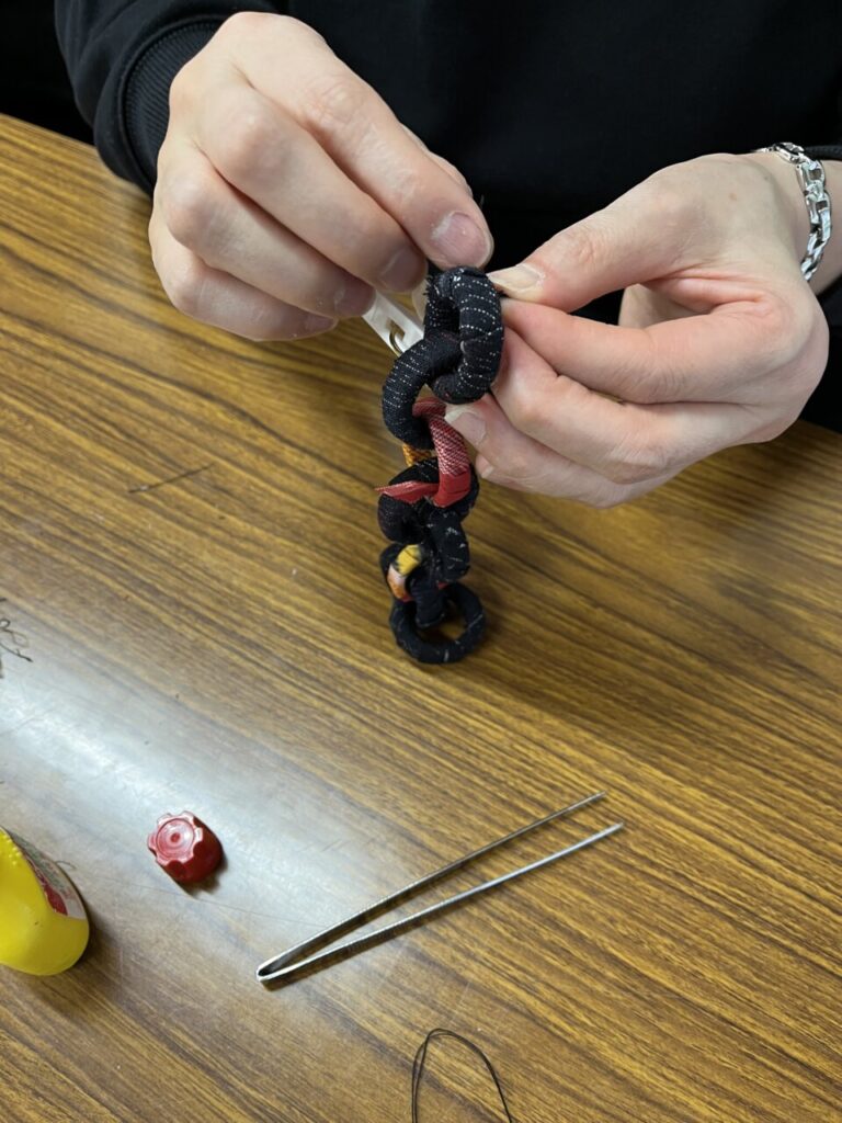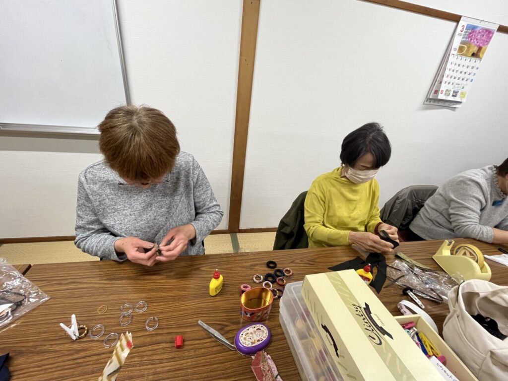 8個出来たら、両端の輪っかにそれぞれ紐を通し、その紐にビーズを一つ通して糸でグルグルまきにして固定する。最後に紐の長さを調節できるように結んだら完成。皆さん手先が器用で予定していた時間より早く出来上がりました。今回は選ぶ布によってオリジナルなネックレスが出来て、皆さんにとても喜んでいただけました。