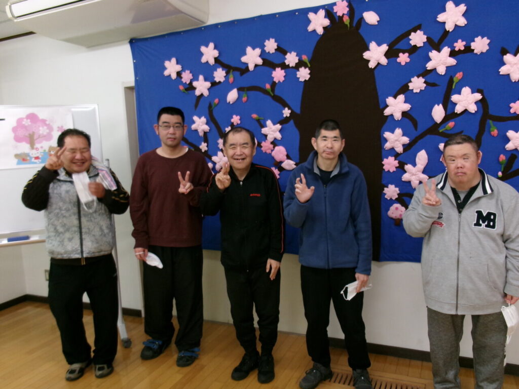 前日の雨でグラウンドの状態が悪く、室内で実施しましたが新居浜市おもちゃ図書館きしゃポッポ様より大きな桜のタペストリーをお借りし、また利用者さんの絵等で会場を飾りつけできたので、とても華やかに開催することができました。