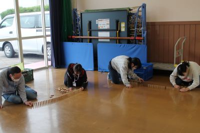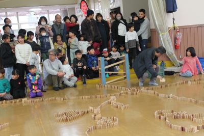 ドミノで遊んでいた人たちの作品に道をつけました。そして、倒す前に放送し参加者の人に集まってもらいました。(ここには写ってないですが、まだまだ人は見ています。)みんなでカウントダウンをして、ドミノ倒しを見届けました。(盛り上がったwa~)