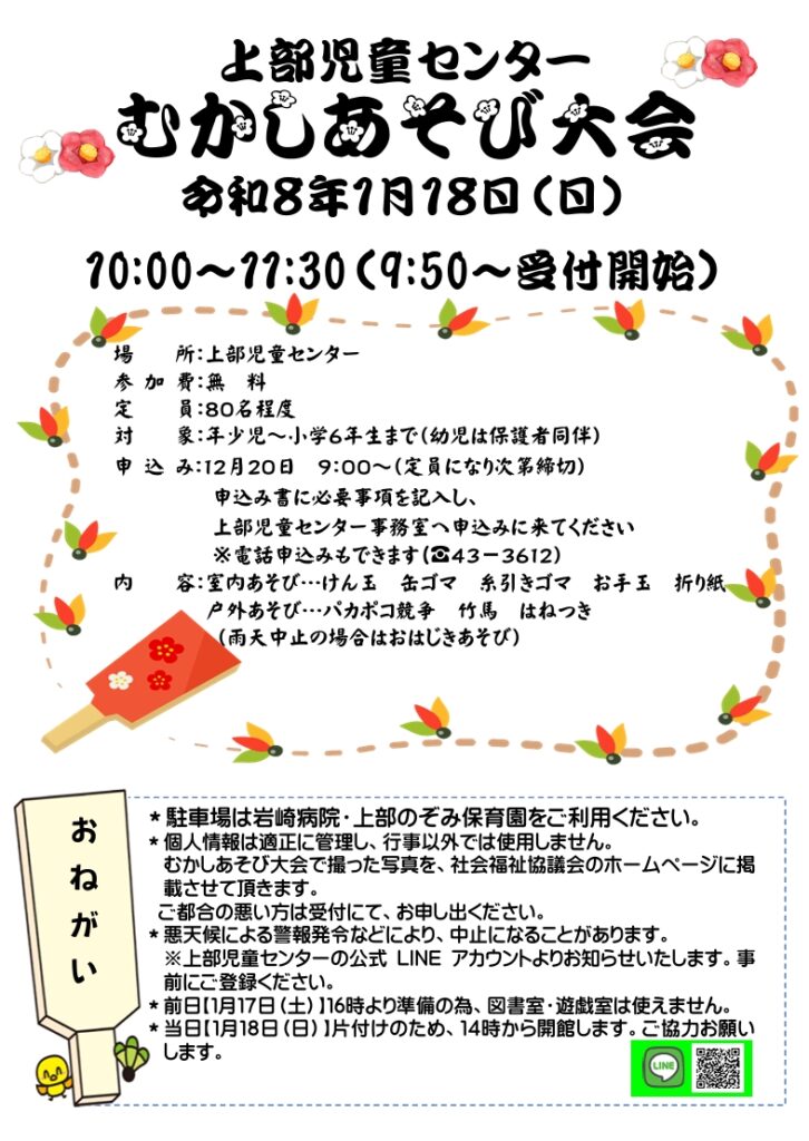 令和8年1月18日(日)10:00~11:30(受付9:50~)『むかしあそび大会』を開催します✨
