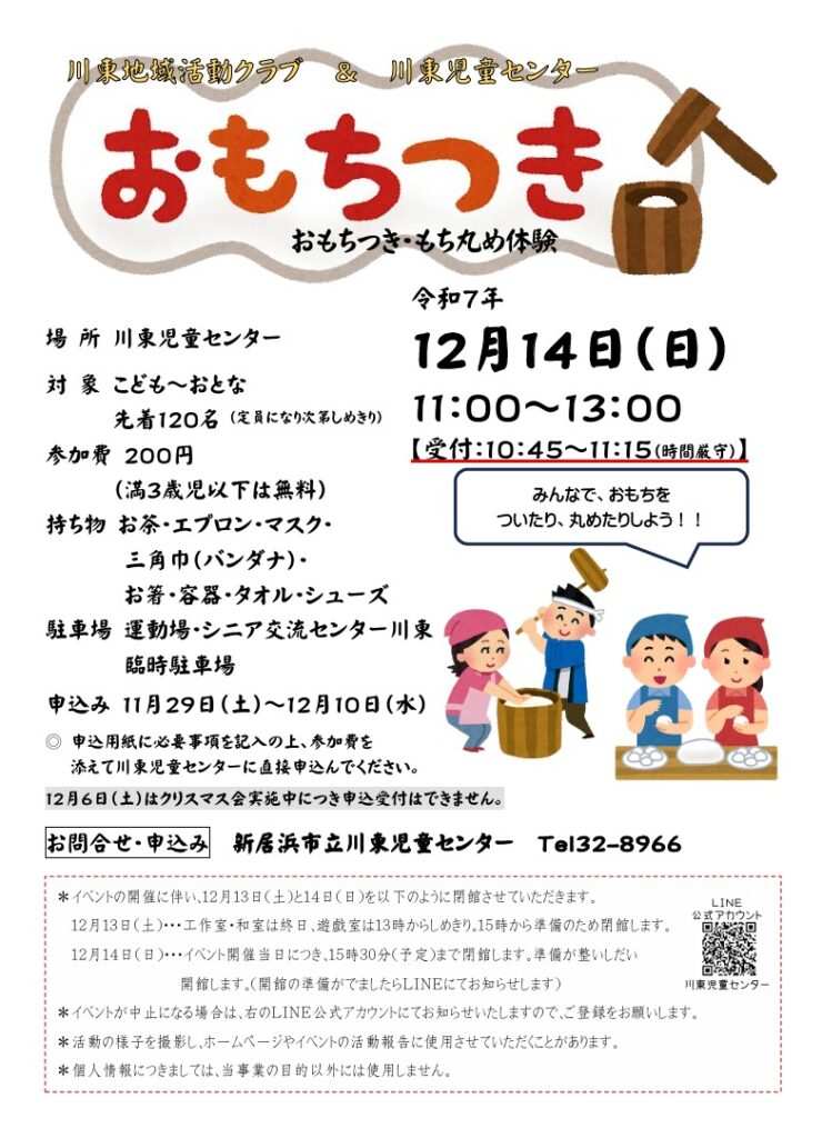 12月14日(日)に川東地域活動クラブ&川東児童センターによる「おもちつき」を開催します。