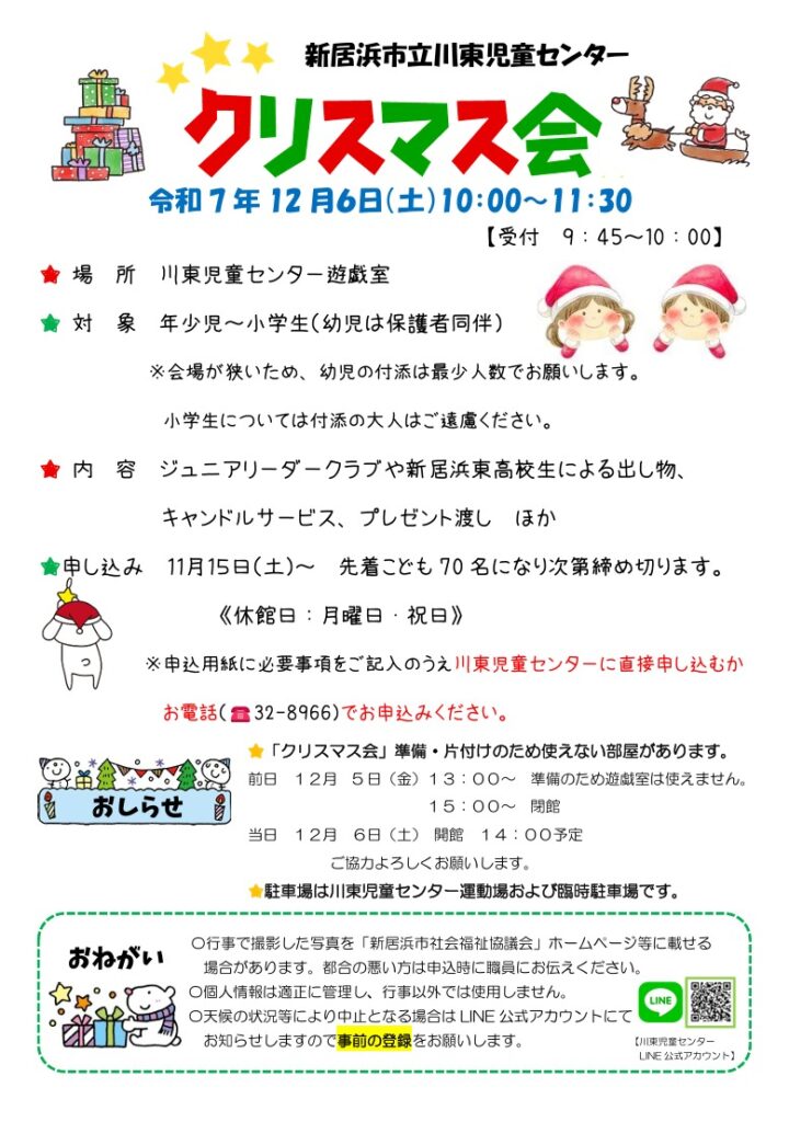 🔔内容:ジュニアリーダークラブや新居浜東高校生による出し物、キャンドルサービス、プレゼント渡し他