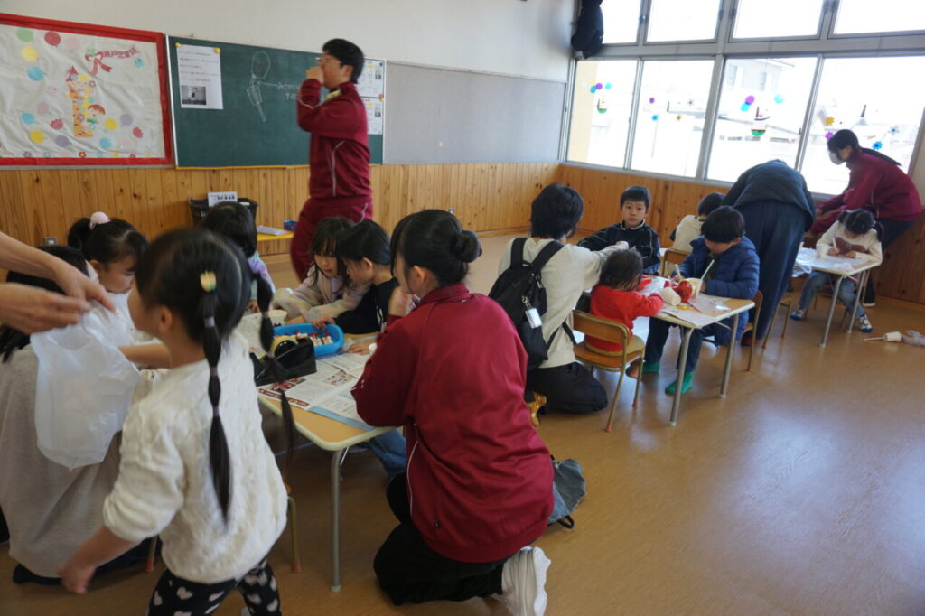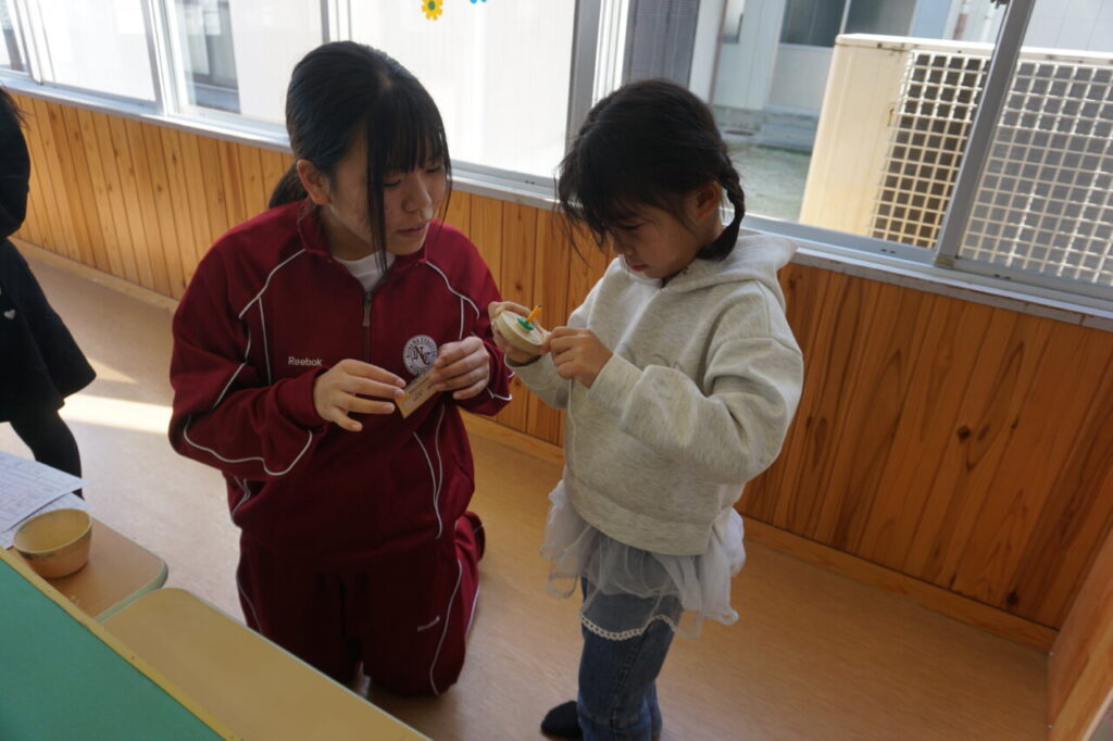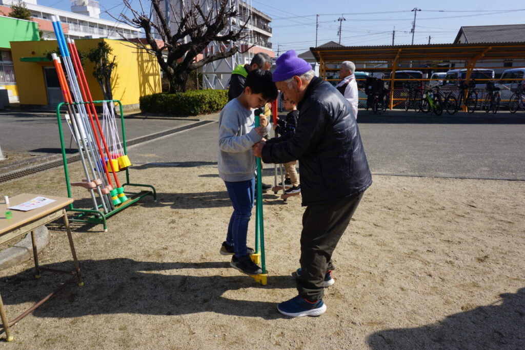 泉川老人会のみなさんに教えてもらって、竹馬や福笑い、輪投げ、缶ごまなどたくさんの〈むかしあそび〉を教えてもらいました(^^♪